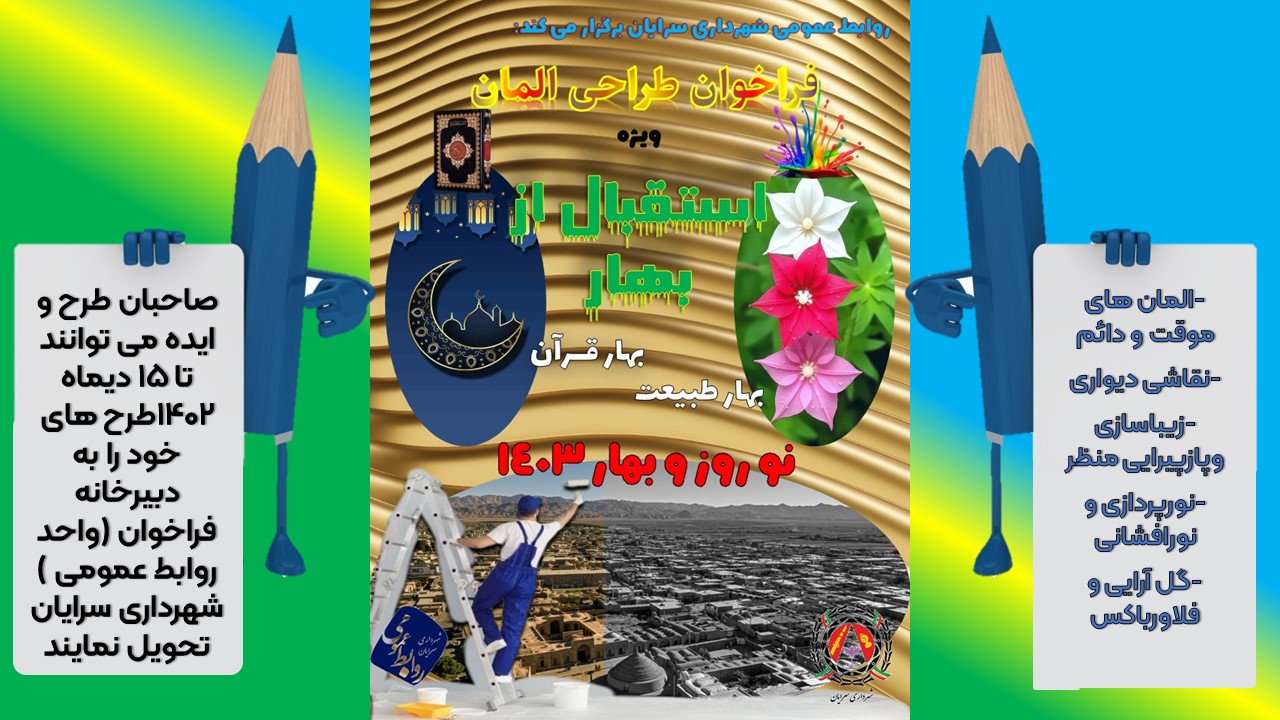 روابط عمومی شهرداری سرایان برگزار می کند: فراخوان طراحی المان ویژه استقبال از بهار1403 -المان های موقت و دائم -نقاشی دیواری -زیباسازی وپازپیرایی منظر -نورپردازی و نورافشانی -گل آرایی و فلاورباکس زمینه...