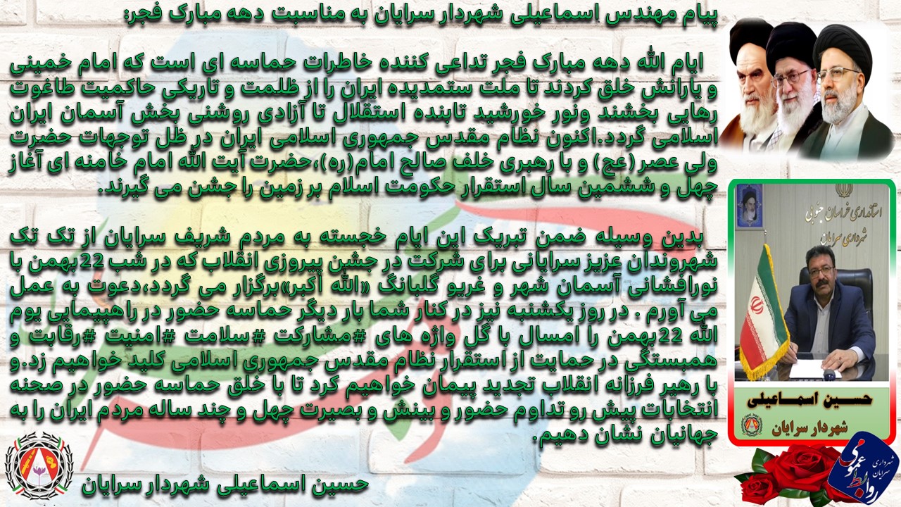 پیام مهندس اسماعیلی شهردار سرایان به مناسبت دهه مبارک فجر: ایام الله دهه مبارک فجر تداعی کننده خاطرات حماسه ای است که امام خمینی و یارانش...