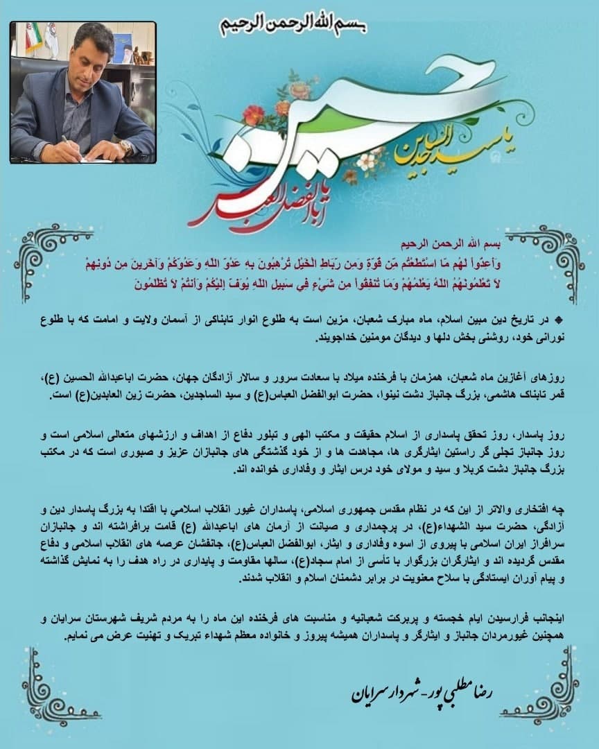 🌹🌹پیام تبریک مهندس مطلبی پورشهردار سرایان به مناسبت فرارسیدن اعیادشعبانیه