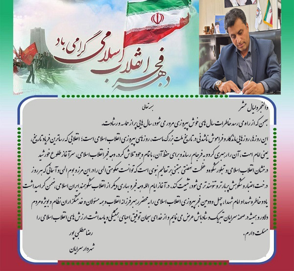مهندس مطلبی پور ضمن صدور پیامی فرارسیدن ایامالله دهه فجر و پیروزی شکوهمند انقلاب را به مردم شریف سرایان تبریک گفت.