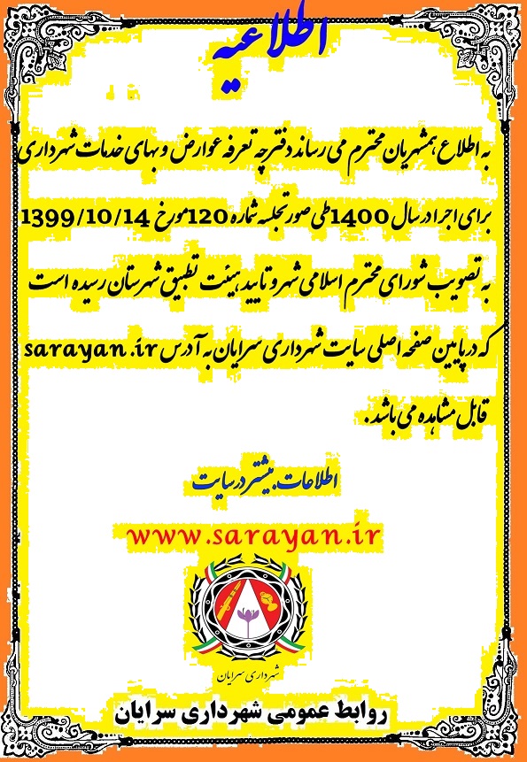 به اطلاع همشهریان محترم می رساند دفترچه تعرفه عوارض و بهای خدمات شهرداری برای اجرا در سال 1400طی صورتجلسه شماره 120مورخ 14/10/1399به تصویب شورای محترم اسلامی شهر و تایید هیئت تطبیق شهرستان رسیده است که در قسمت پایین صفحه اصلی، (سایت شهرداری سرایان به آدرس sarayan .ir) قابل مشاهده می باشد .