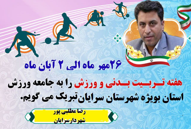 به مناسبت ( 26 مهر الی 2 آبان ) هفته تربیت بدنی و ورزش ،شهردارسرایان به همراه اعضای شورای اسلامی با حضور در اداره ورزش و جوانان شهرستان ضمن بازدید از واحدهای مختلف این اداره، هفته ورزش و تربیت بدنی را به رئیس و کارکنان این اداره تبریک گفتند.👇👇👇