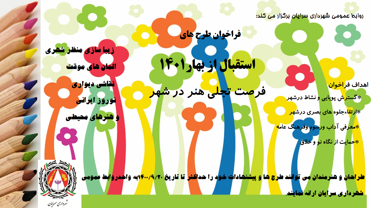 طراحان و هنرمندان می توانند طرح ها و پیشنهادات خود را حداکثر تا تاریخ 1400/9/20به واحد روابط عمومی شهرداری سرایان ارایه نمایند