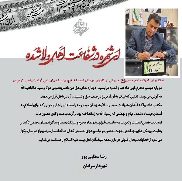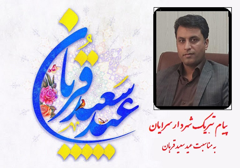 اینجانب عید سعید غدیر خم، عید ولایت مولی الموحدین حضرت امیر المومنین علی(ع) رابه محضرحضرت بقیه الله الاعظم(ارواحنا له الفدا) ، و عموم مردم شریف شهرستان سرایان تبریک و تهنیت عرض نموده، موفقیت همگان را از درگاه خداوند متعال خواستارم.