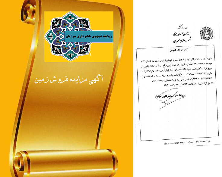 شهرداري سرايان در نظر دارد به استناد مصوبه شوراي اسلامي شهر به شماره 713 مورخه 30/10/1400 نسبت به فروش دو قطعه زمين واقع در بلوار خيابان نيلوفر از طريق مزايده كتبي اقدام نمايد. لذا متقاضيان واجد شرايط مي توانند تا پايان وقت اداري 21/11/1400 جهت كسب اطلاعات بيشتر و دريافت مدارك به سايت sarayan.ir www. يا به شهرداري سرايان واحد مالي مراجعه نمايند.