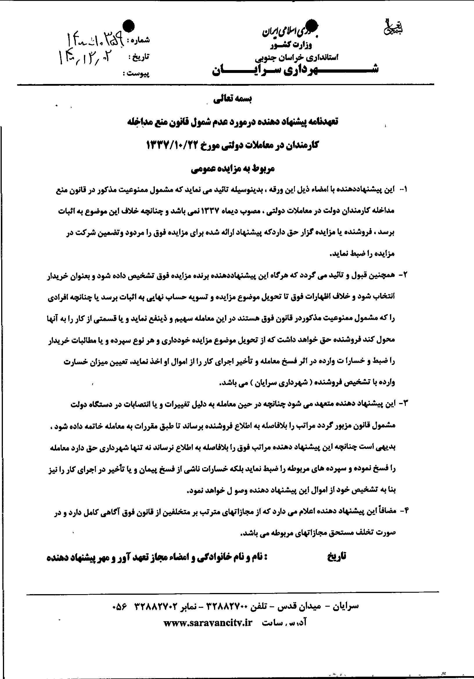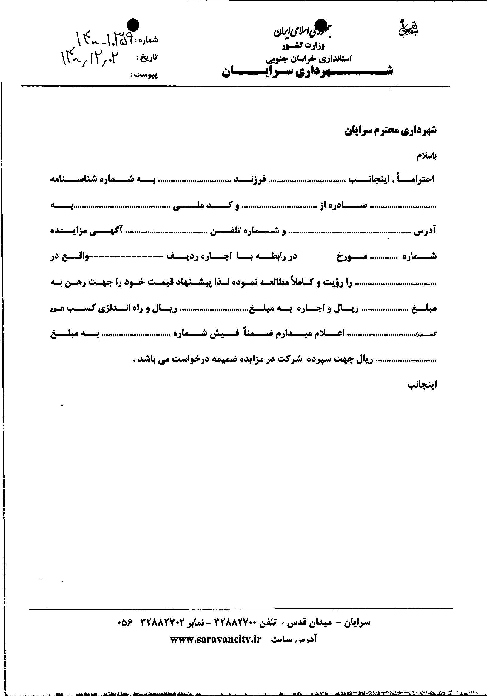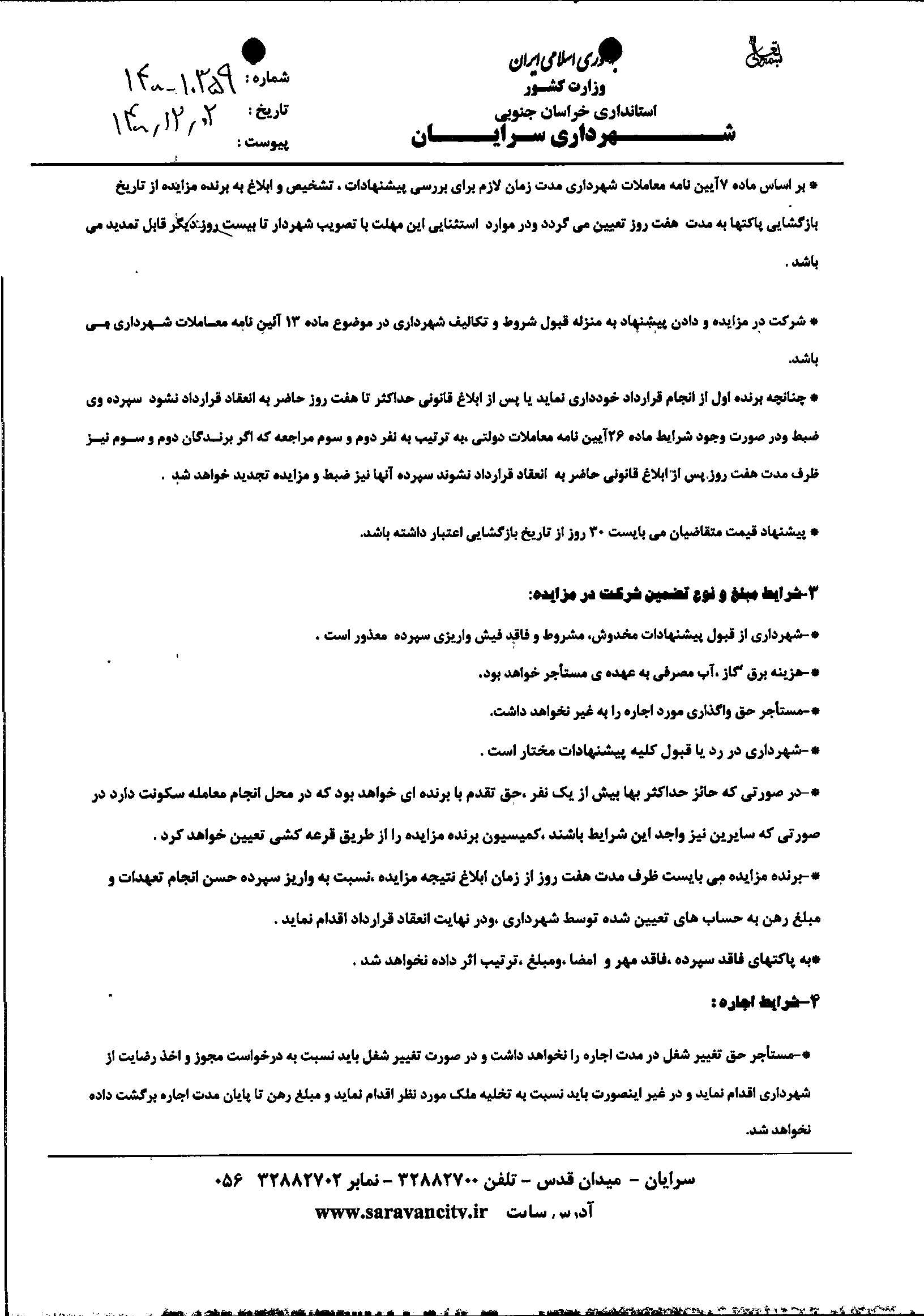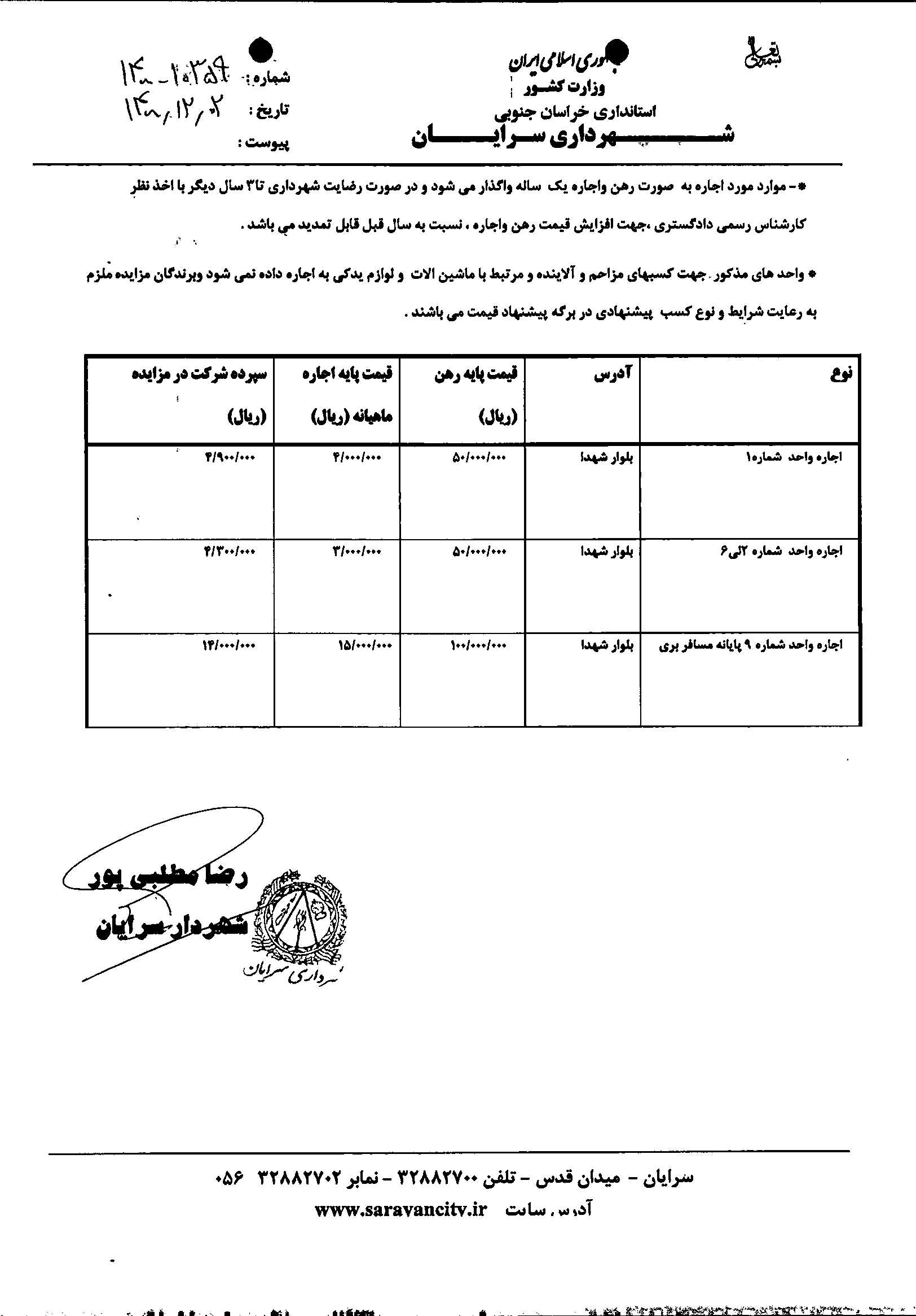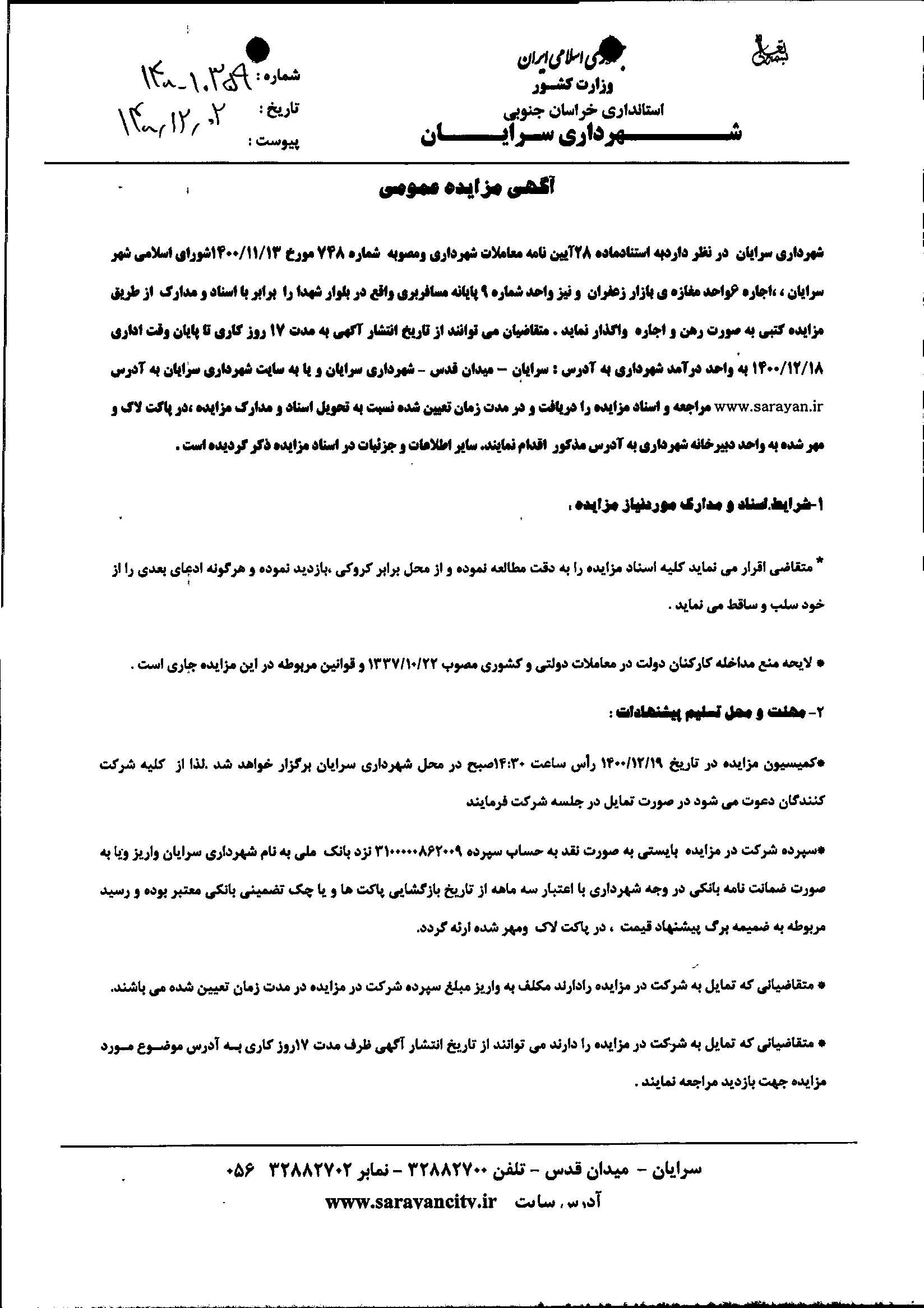 شهرداري سرايان در نظر دارد به استناد مصوبه شوراي اسلامي شهر به شماره 748 مورخه 13/11/1400 نسبت به اجاره واحدهاي تجاري واقع در بلوار شهدا و واحد 9 جنب پايانه مسافربري از طريق مزايده كتبي اقدام نمايد. لذا متقاضيان واجد شرايط مي توانند تا پايان وقت اداري 18/12/1400 جهت كسب اطلاعات بيشتر به شهرداري سرايان واحد مالي مراجعه نمایند.