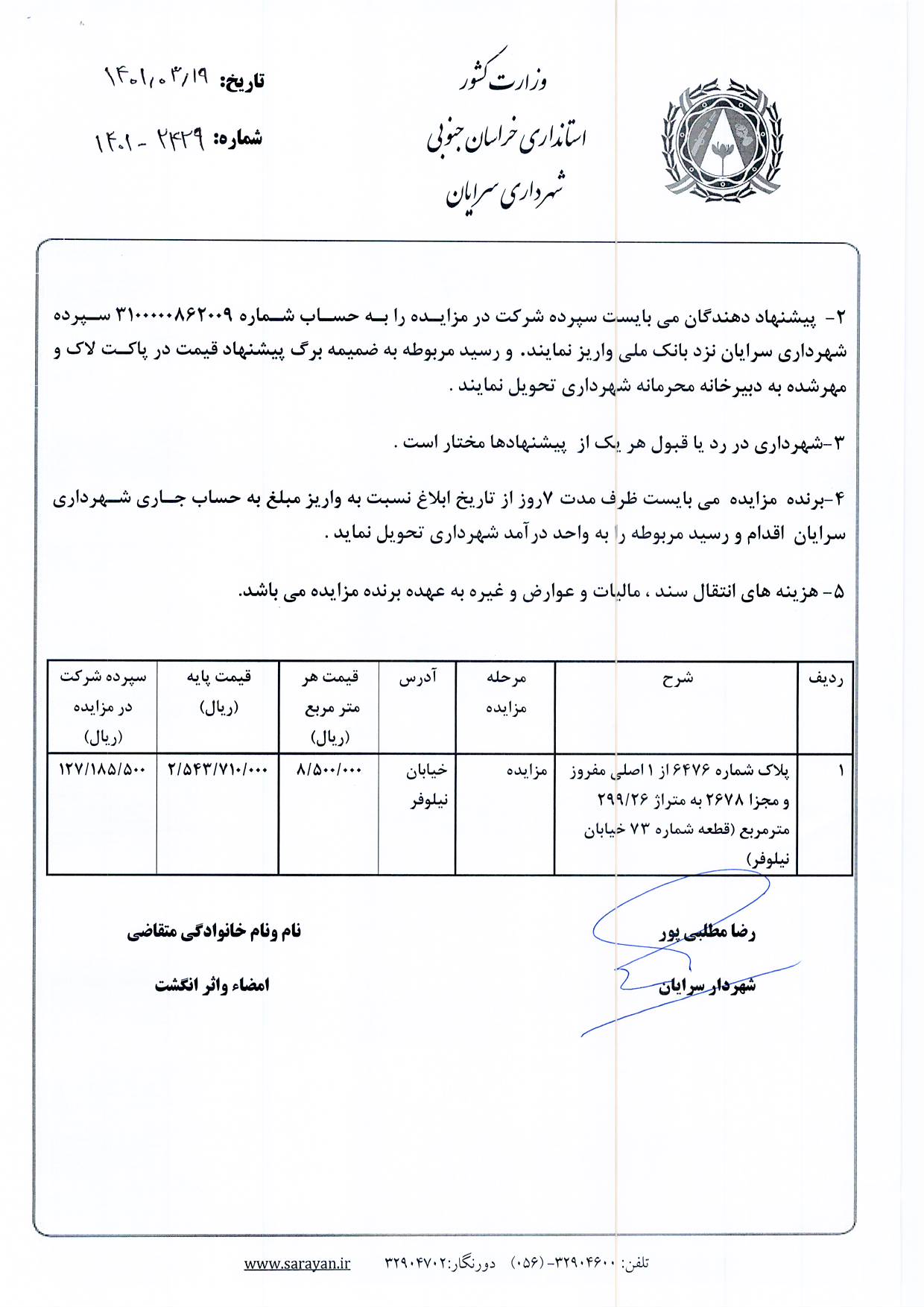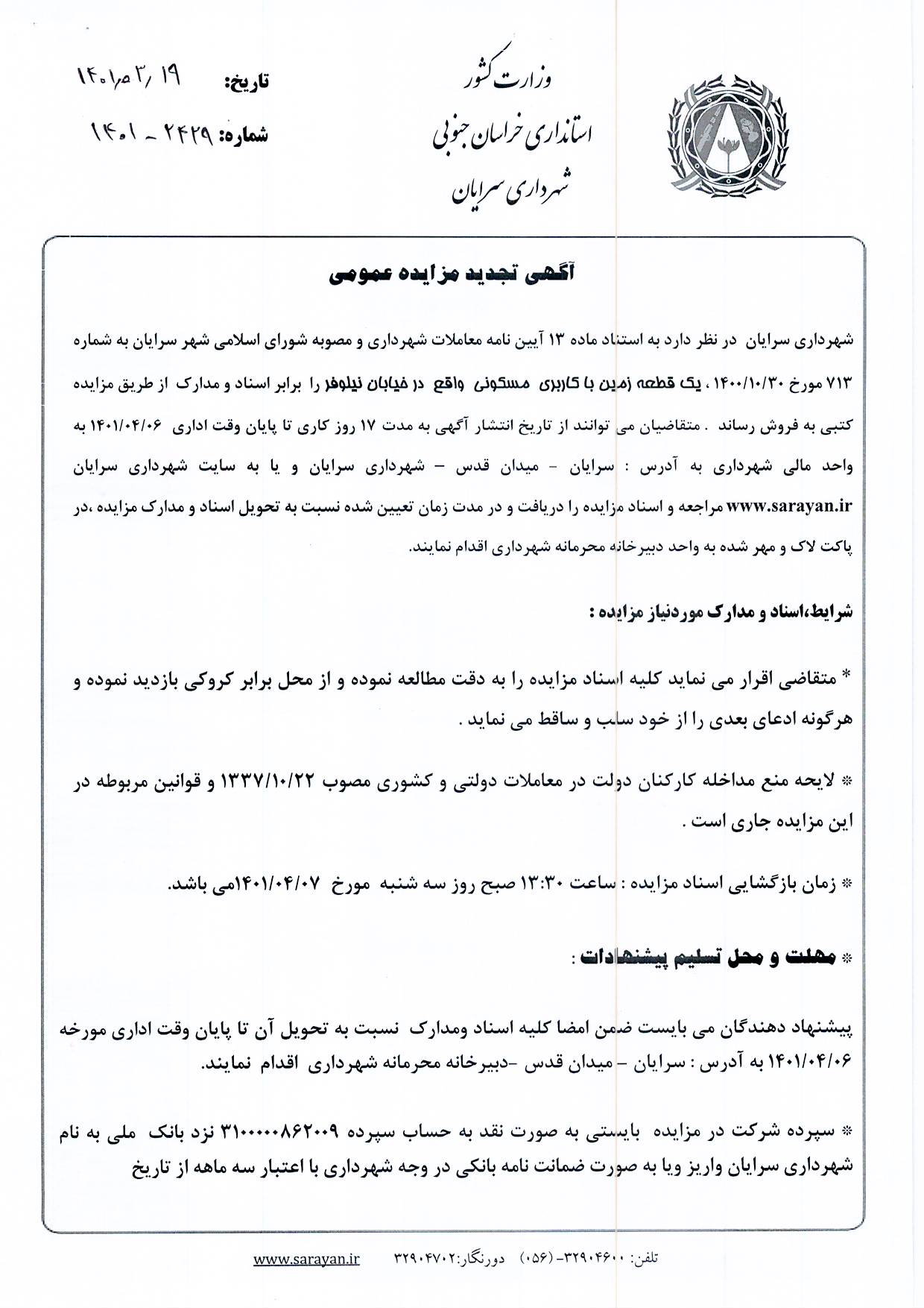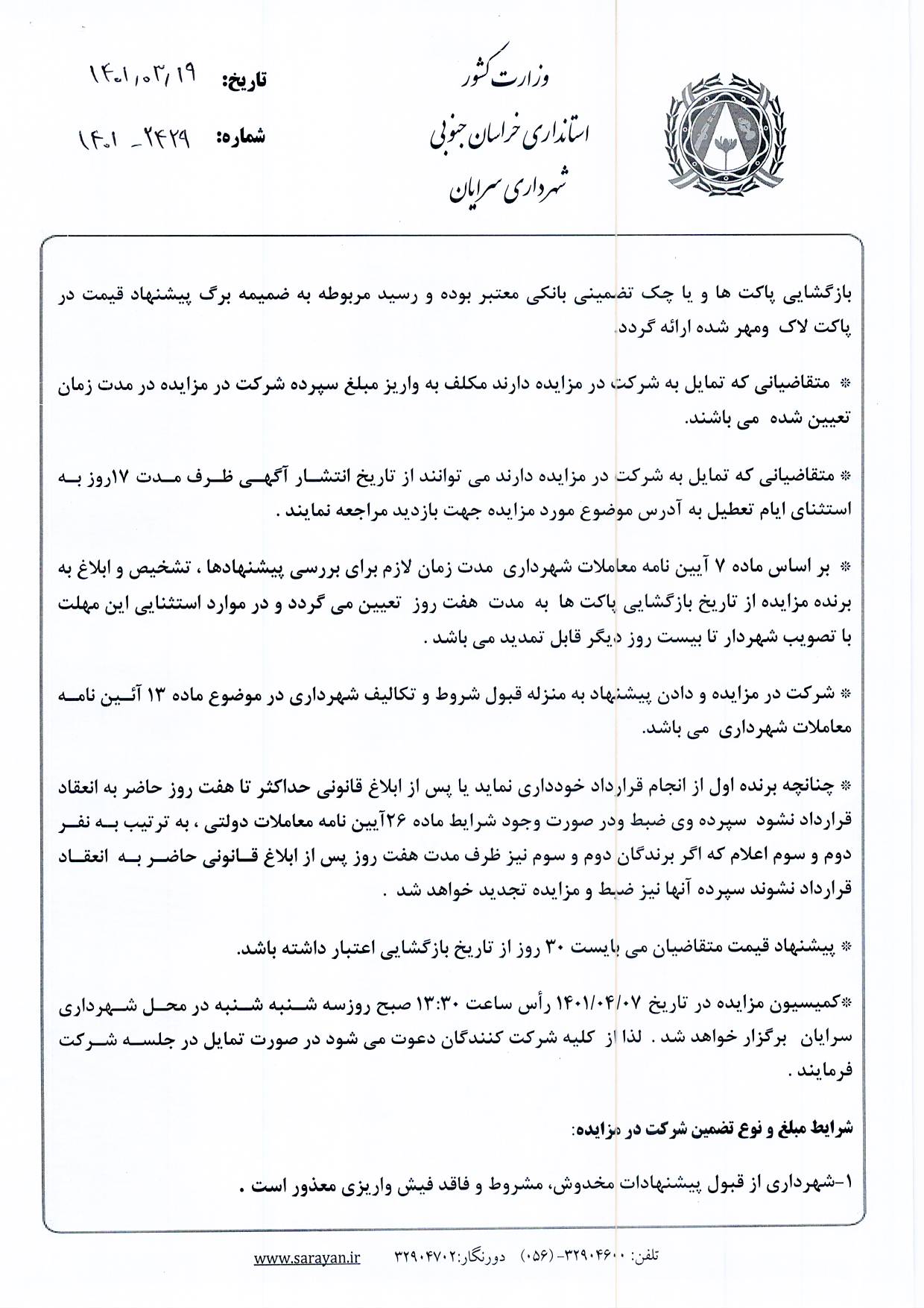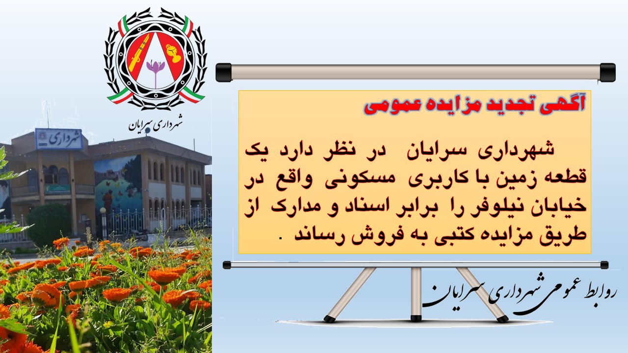 شهرداری سرایان در نظر دارد به استناد ماده 13 آیین نامه معاملات شهرداری و مصوبه شوراي اسلامی شهر سرایان به شماره 713 مورخ 30/10/1400 ، يك قطعه زمين با كاربري مسكوني واقع در خيابان نيلوفر را برابر اسناد و مدارک از طریق مزایده كتبي به فروش رساند . متقاضیان می توانند از تاریخ انتشار آگهی به مدت 17 روز كاري تا پايان وقت اداری 06/04/1401 به واحد مالي شهرداري به آدرس : سرایان - ميدان قدس – شهرداري سرایان و یا به سايت شهرداري سرایان www.sarayan.ir مراجعه و اسناد مزایده را دریافت و در مدت زمان تعیین شده نسبت به تحویل اسناد و مدارک مزایده ،در پاکت لاک و مهر شده به واحد دبیرخانه محرمانه شهرداری اقدام نمایند.