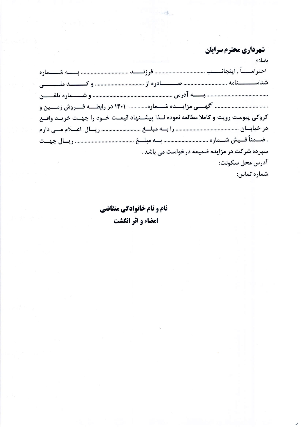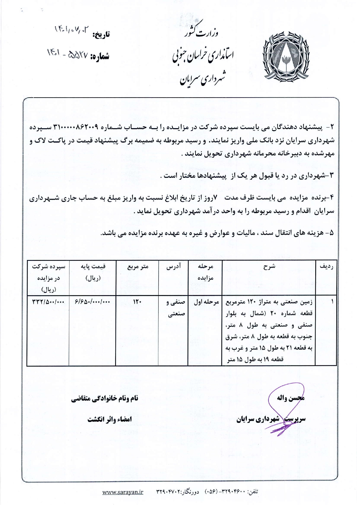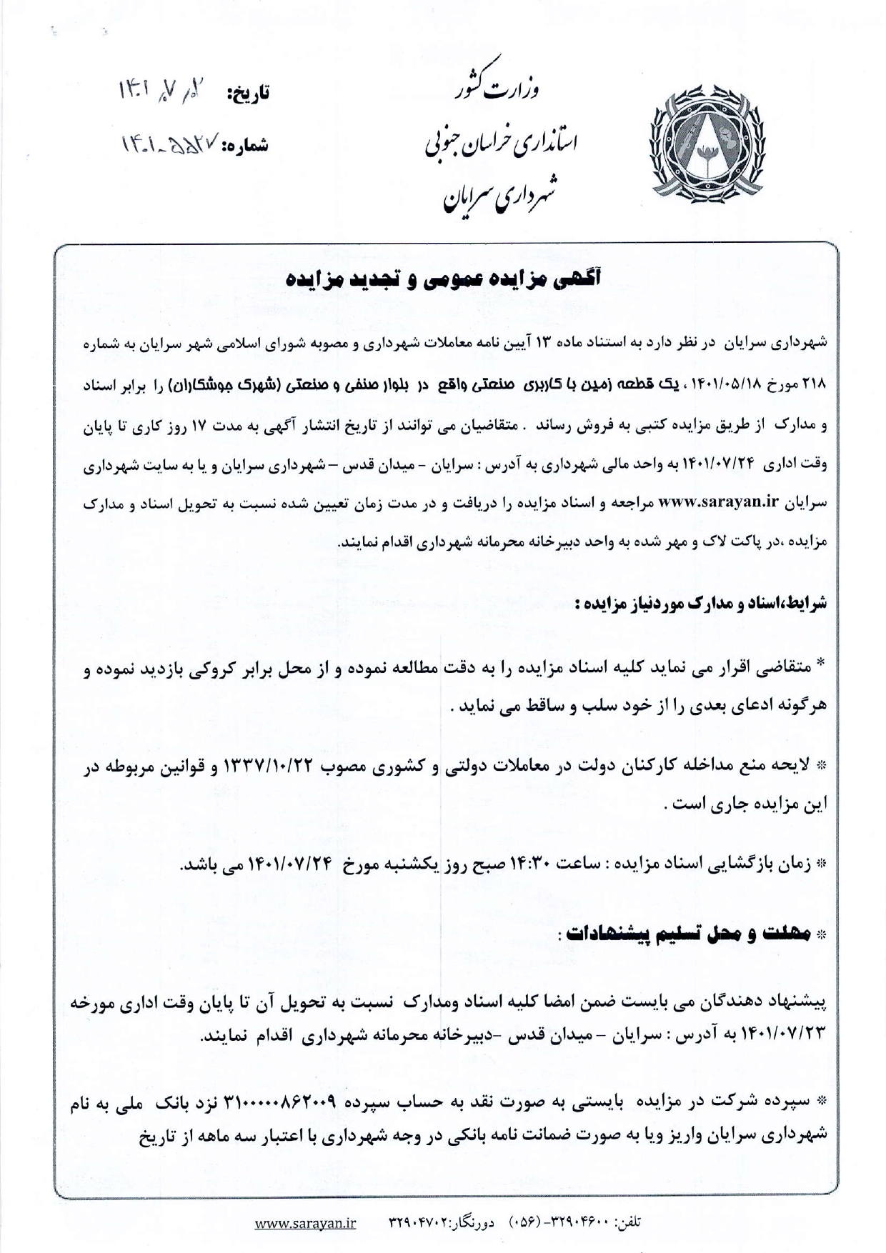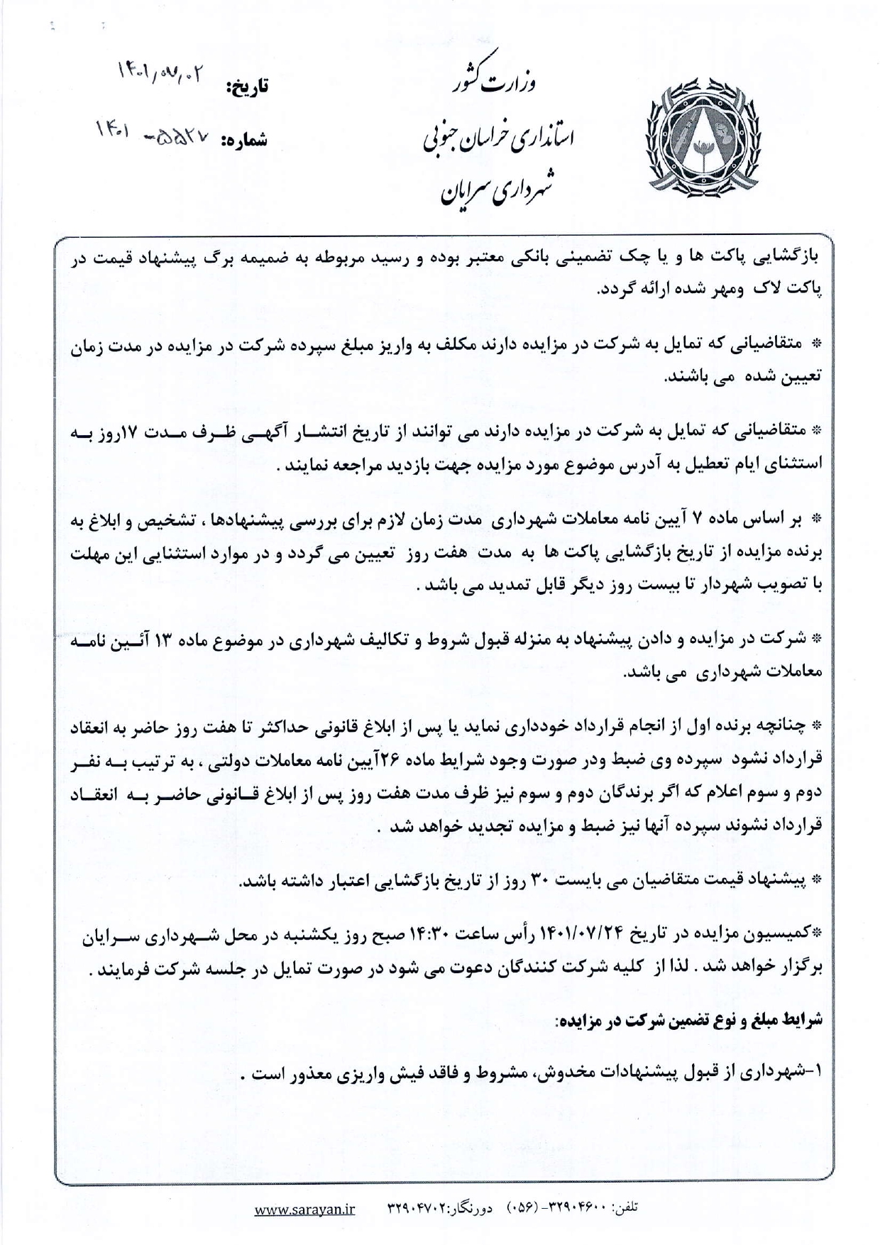 شهرداري سرايان در نظر دارد به استناد مصوبه شوراي اسلامي شهر به شماره 218 مورخه 18/05/1401 نسبت به فروش يك قطعه زمين واقع در بلوار صنفي و صنعتي از طريق مزايده كتبي اقدام نمايد. لذا متقاضيان واجد شرايط مي توانند تا پايان وقت اداري 23/07/1401 جهت كسب اطلاعات بيشتر و دريافت مدارك به سايت www.sarayan.ir يا به شهرداري سرايان واحد مالي مراجعه نمايند.