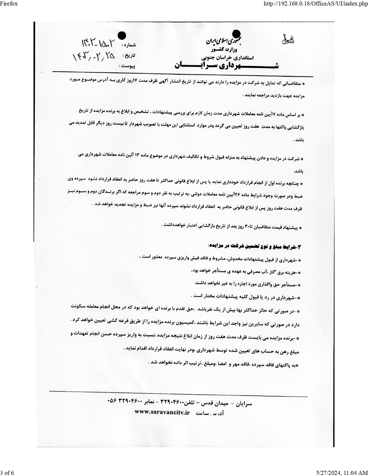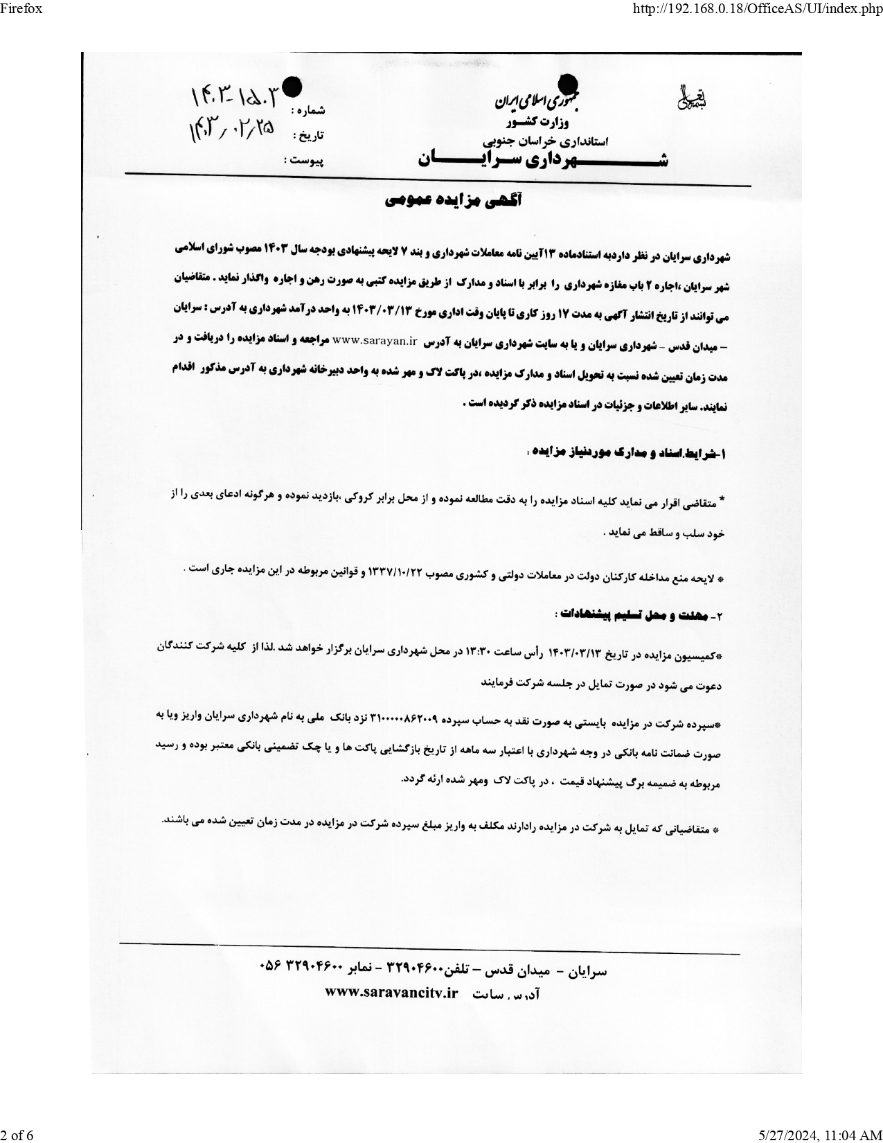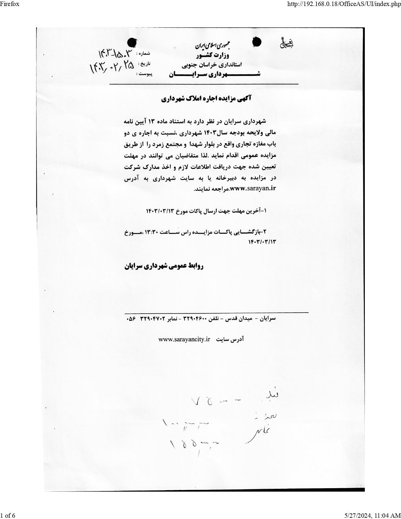 شهرداری سرایان در نظر دارد به استناد ماده 13 آیین نامه مالی ولایحه بودجه سال1403 شهرداری ،نسبت به اجاره ی دو باب مغازه تجاری واقع در بلوار شهدا و مجتمع زمرد را از طریق مزایده عمومی اقدام نماید .لذا متقاضیان می توانند در مهلت تعیین شده جهت دریافت اطلاعات لازم و اخذ مدارک شرکت در مزایده به دبیرخانه یا به سایت شهرداری به آدرس www.sarayan.ir.مراجعه نمایند.