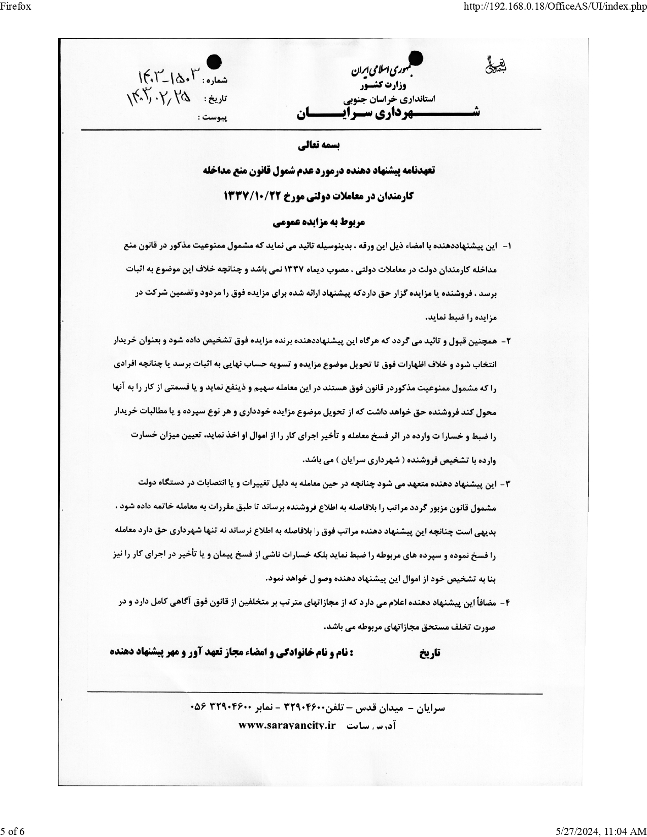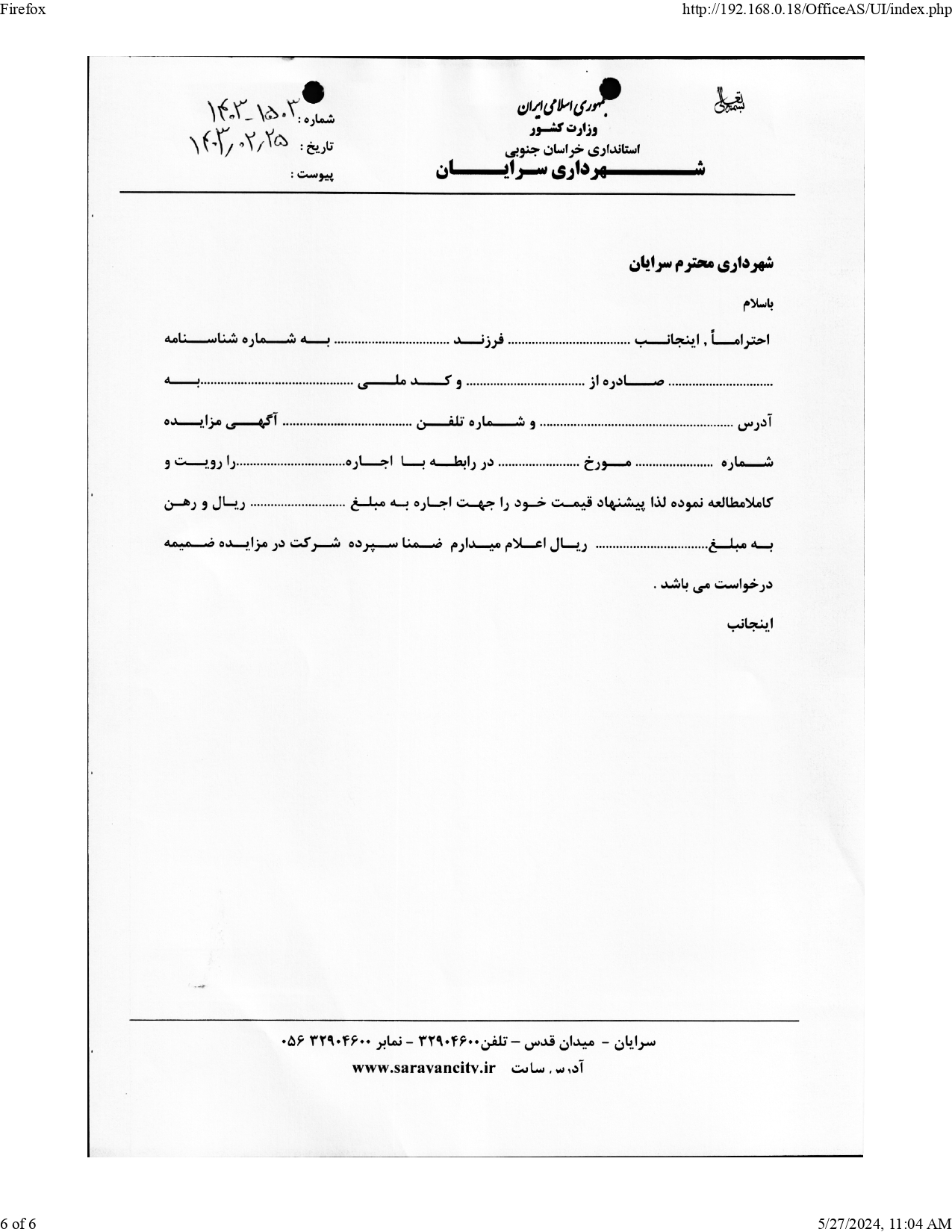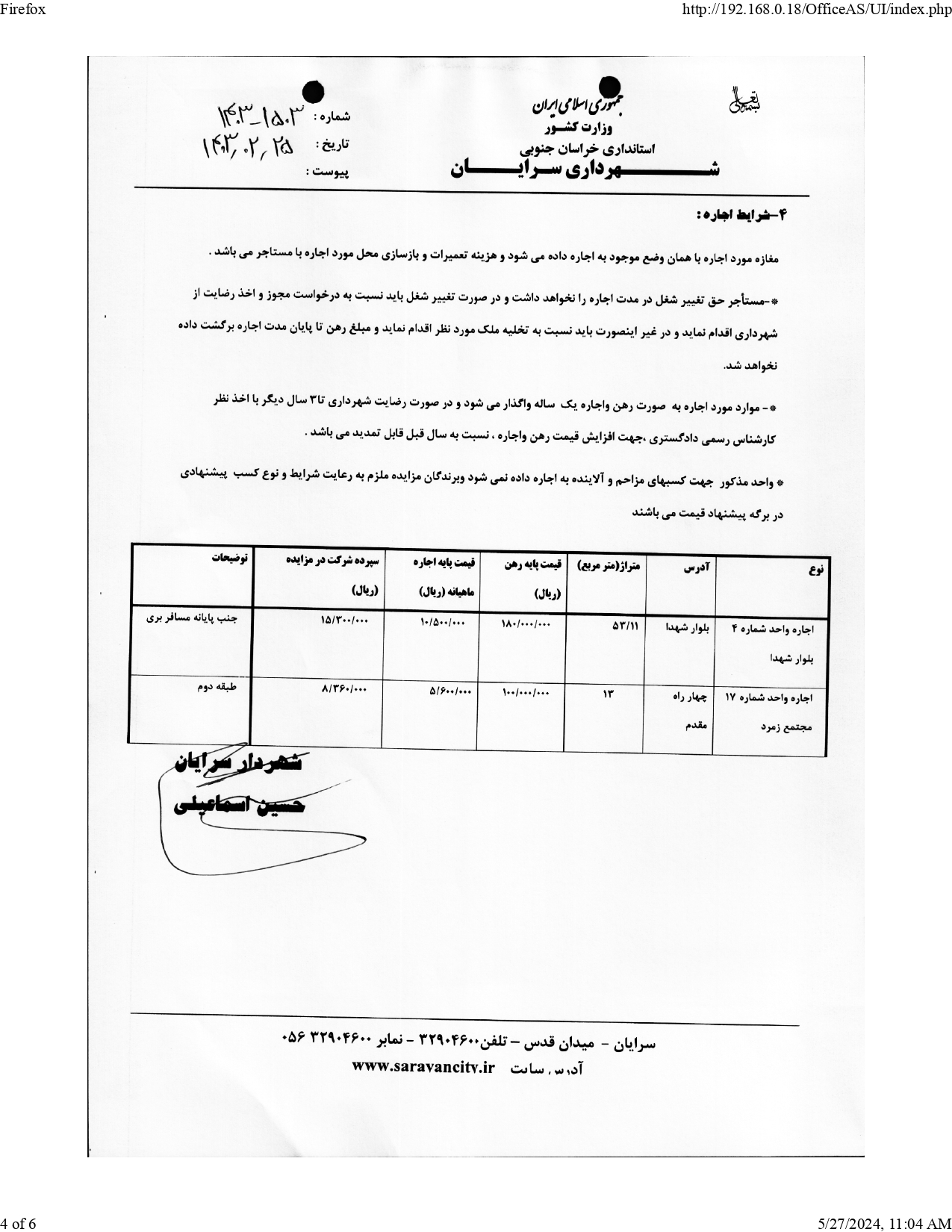 شهرداری سرایان در نظر دارد به استناد ماده 13 آیین نامه مالی ولایحه بودجه سال1403 شهرداری ،نسبت به اجاره ی دو باب مغازه تجاری واقع در بلوار شهدا و مجتمع زمرد را از طریق مزایده عمومی اقدام نماید .لذا متقاضیان می توانند در مهلت تعیین شده جهت دریافت اطلاعات لازم و اخذ مدارک شرکت در مزایده به دبیرخانه یا به سایت شهرداری به آدرس www.sarayan.ir.مراجعه نمایند.